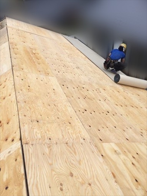 作業中に小雨が降り始めましたがルーフィングの敷設まで完了していれば心配ありません。